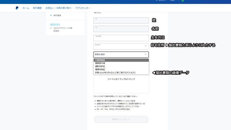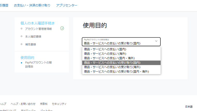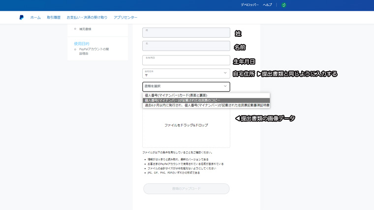 ペイパルのビジネスアカウントを登録し、ログインできるようになると、次は本人確認のための書類提出があります。