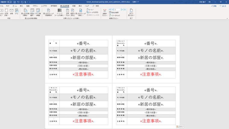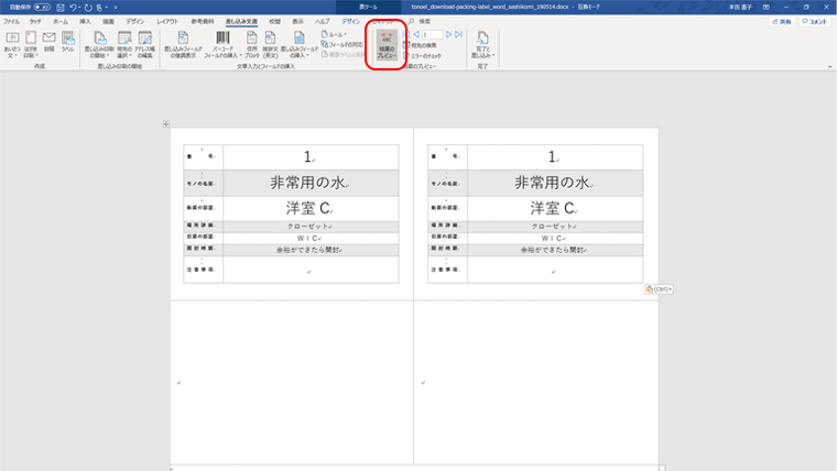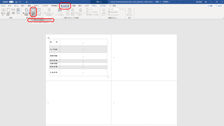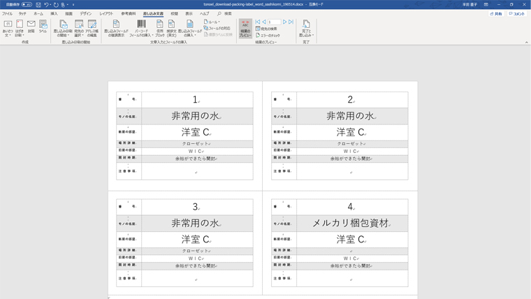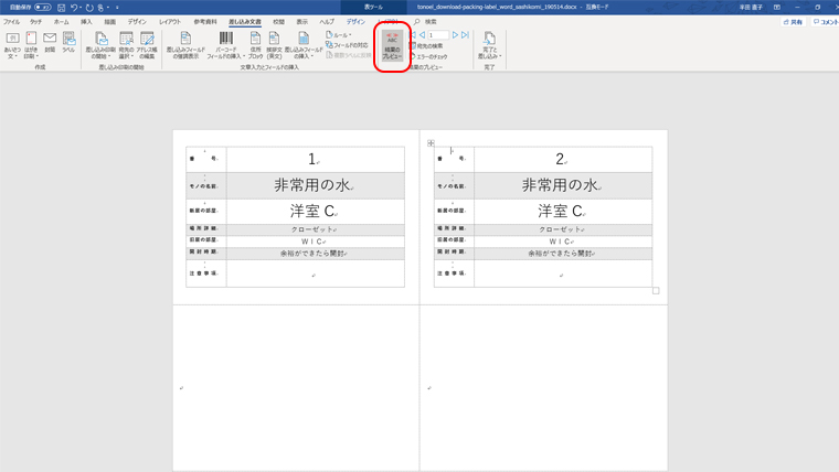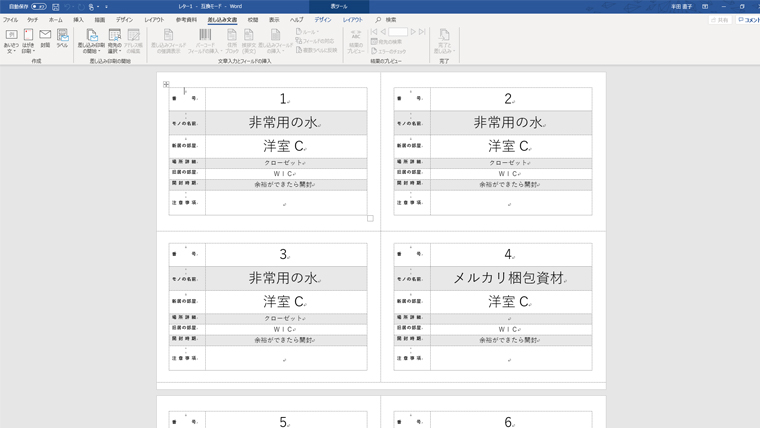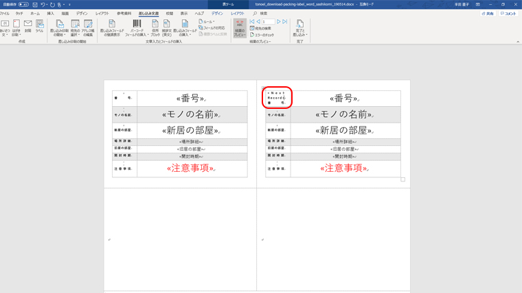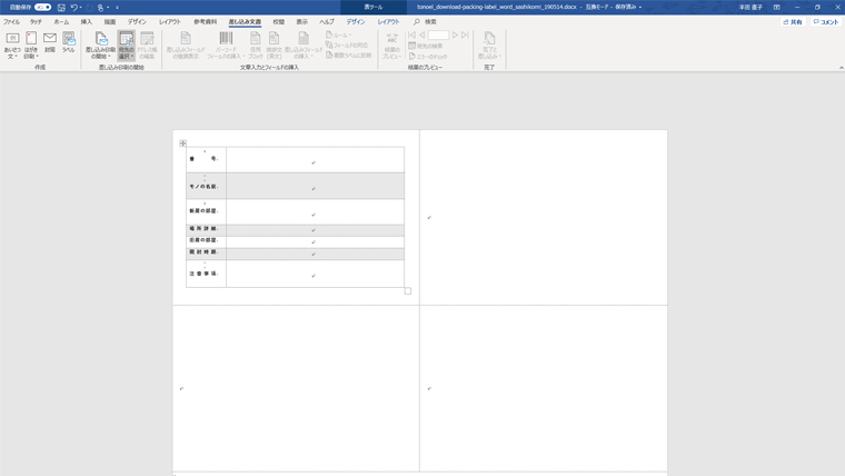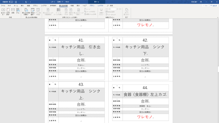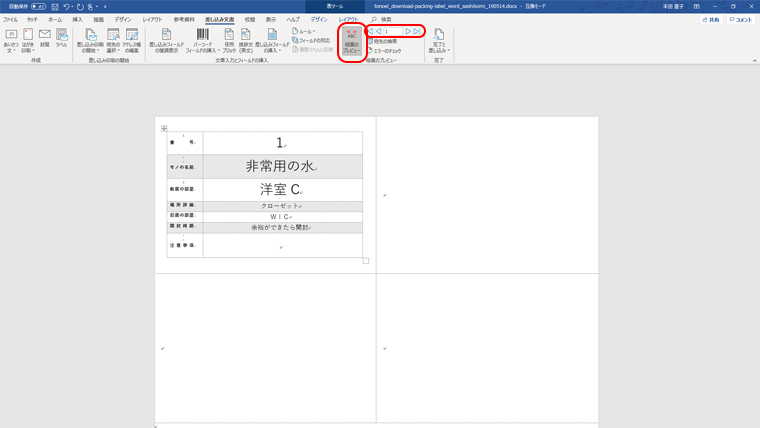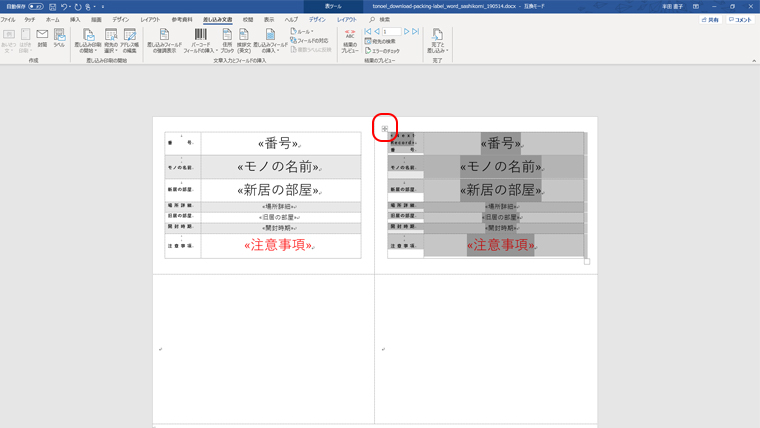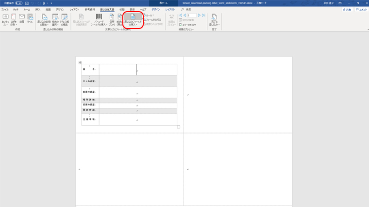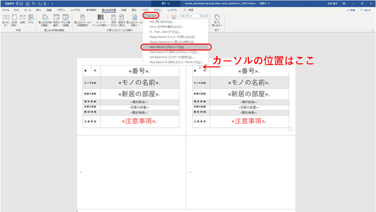 ワードの「荷物ラベル」に差し込み印刷をしましょう。