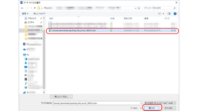 Excel版「荷物リスト」を保存しているフォルダを指定し、ファイルを選択したら「開く」をクリックします。