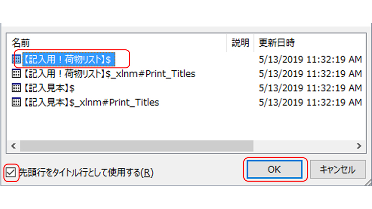 「先頭行をタイトル行として使用する」にチェックを入れて、