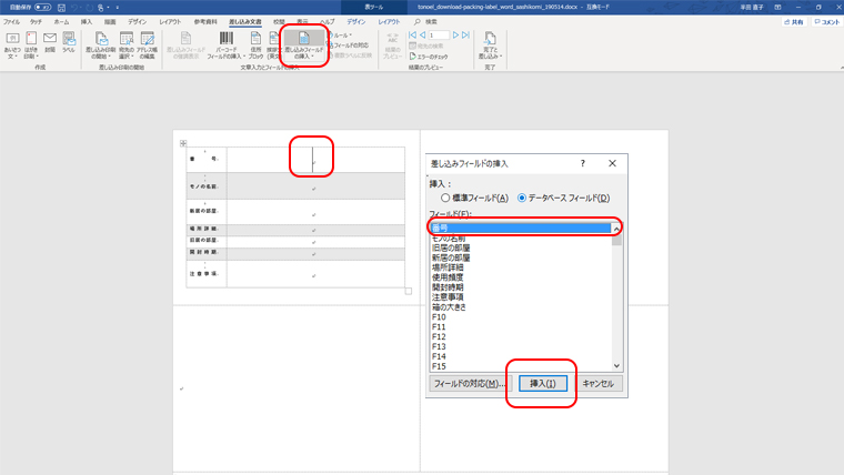 「差し込みフィールドの挿入」から、フィールドを選び、「挿入」します。