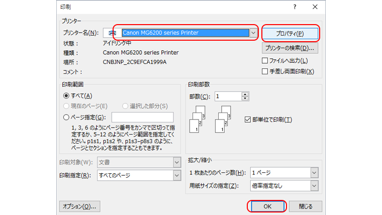 プリンターを選択し、「プロパティ」からプリンターの印刷設定を終了しましたら、「OK」をクリックし、印刷します。