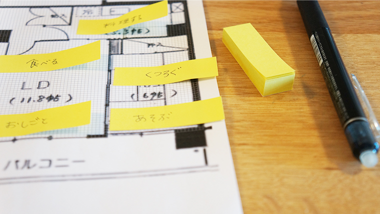 収納プラン策定の準備として、間取り図にどこで何をするかを考えて付箋を貼る、
