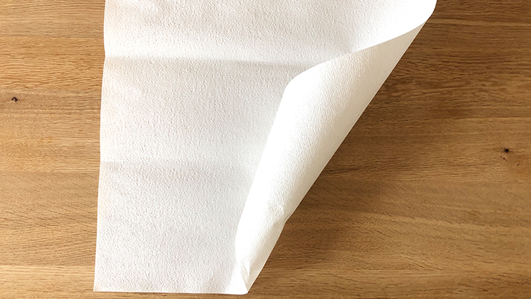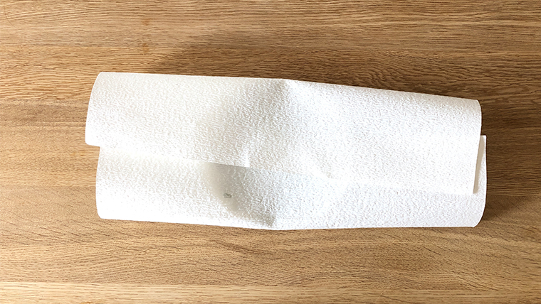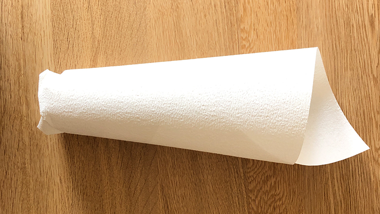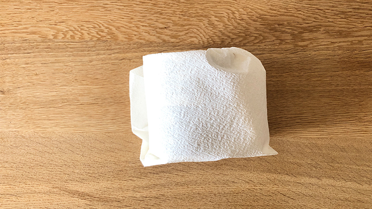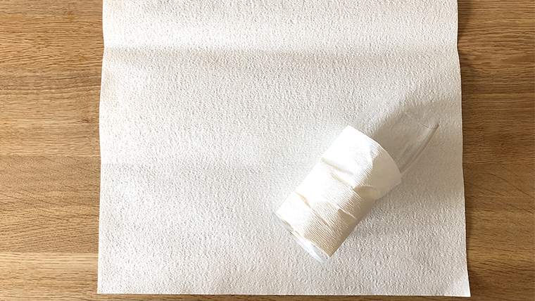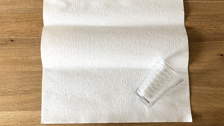 コップは緩衝用のクレープ紙(新聞紙)の手前角にのせ、コップを一周巻きます。
