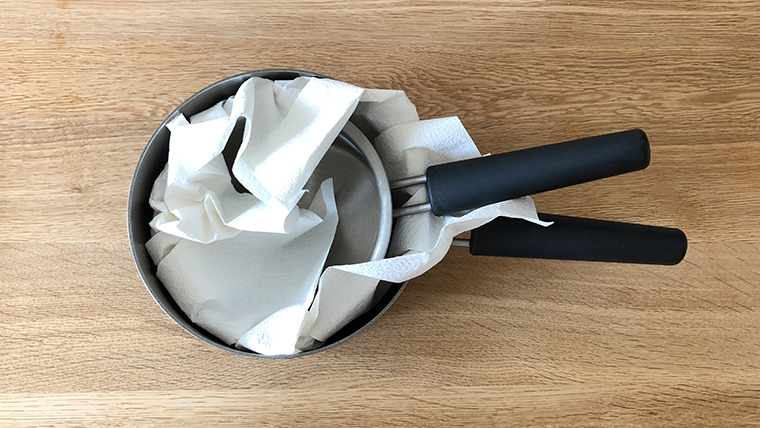 フタは、ガラス製の場合は、大きな皿を包むのと同じ要領で梱包し、立てて入れましょう。