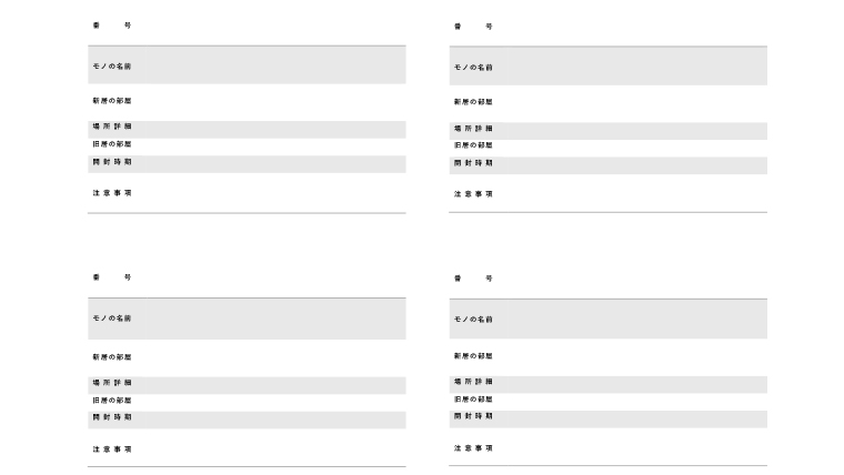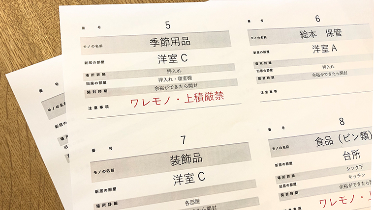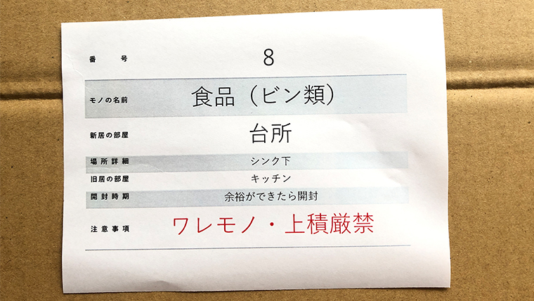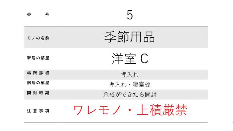 記載すべき情報は、「通し番号」「旧居の部屋」「新居の部屋」「場所詳細」「開封時期」「注意事項(ワレモノ・上積厳禁など)」がオススメ。